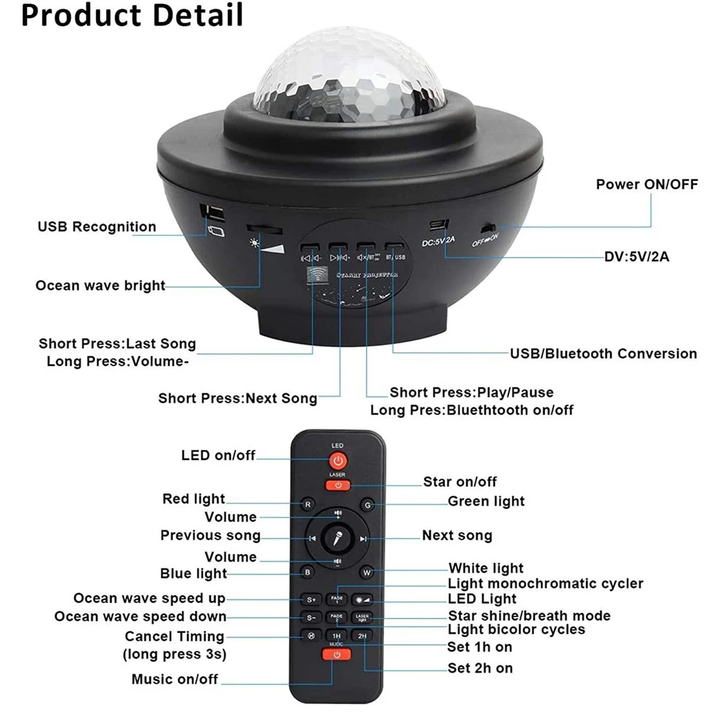 - Remote & Sound Activated & Auto-Off Timer: The LBell latest remote controller ocean wave night light projector with sound-activated flicker mode. Freely turn on / off the lamp, change lighting mode, cycle through light effects, adjust brightness, start / stop the motion or adjust the volume. Sound motion sensor allows the projection changing the color according to the music beat or clapping your hands, creating a discoor party effect. 3 Auto-off timer options, built-in 1H / 2H / turn off.